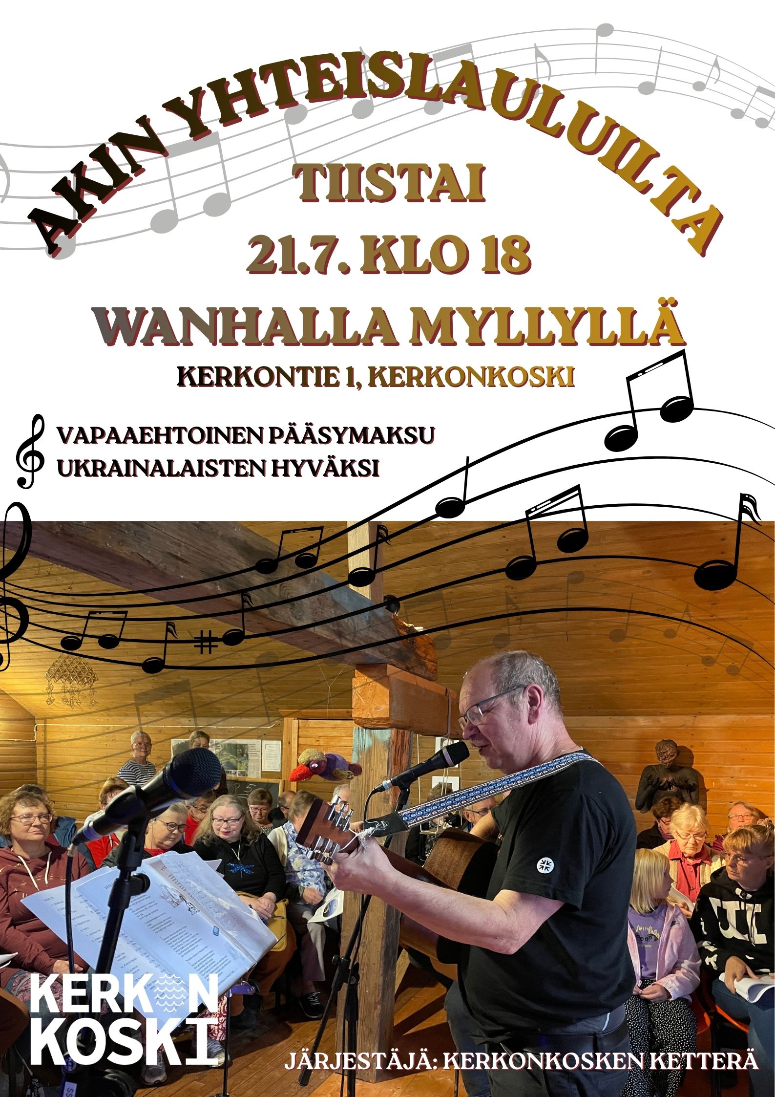Tervetuloa laulamaan yhteislauluja Aki Virran kanssa Wanhalle Myllylle (os. Kerkontie 1, 77930 Kerkonjoensuu)!