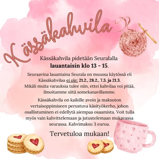 Tervetuloa kässäkahvilaan seuraavina lauantaina: