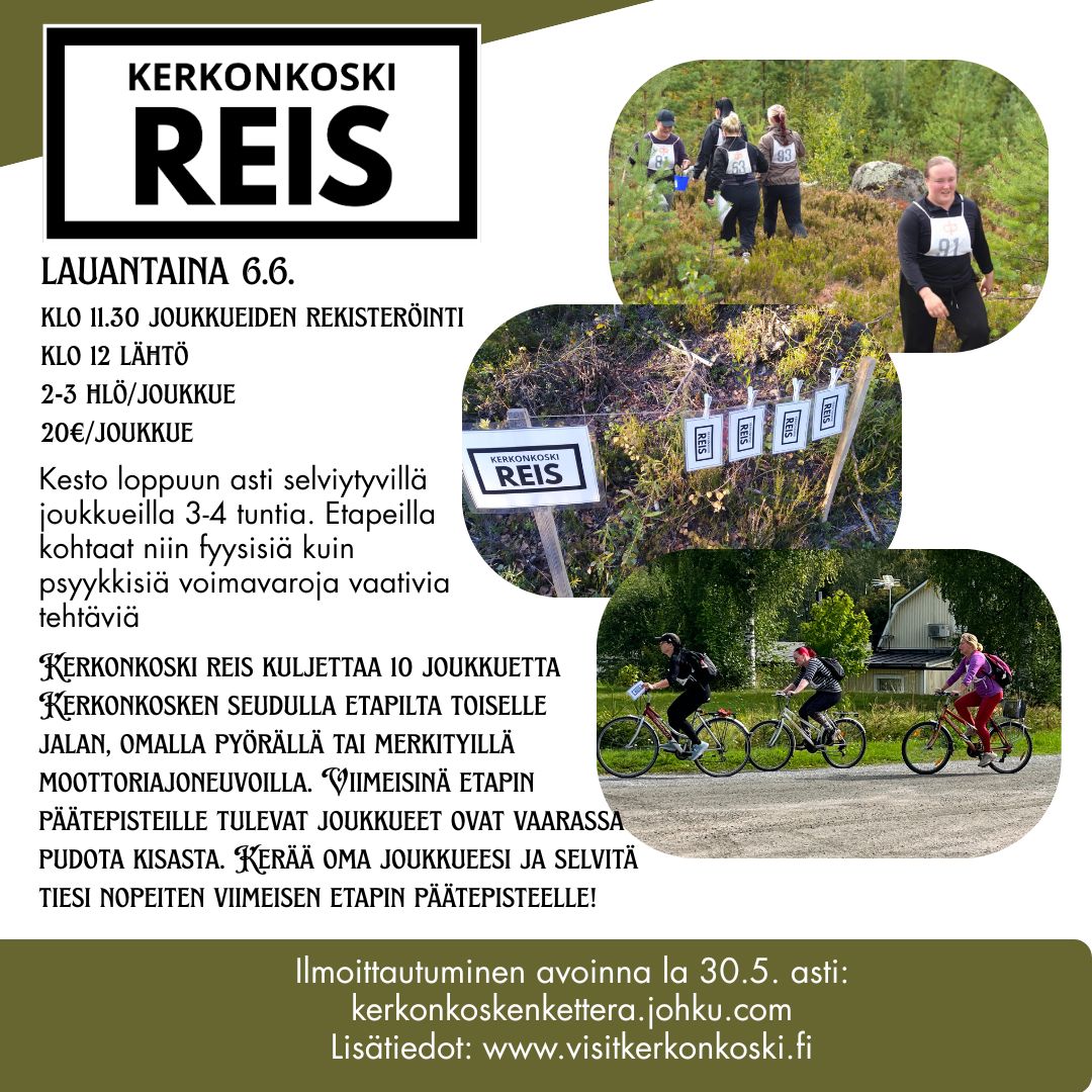 Kerkonkoski reis -kilpailussa 2-3 henkilön joukkueet kulkevat Kerkonkoskella ja kisaavat siitä, ketkä heistä pääsevät ensimmäisenä kunkin etapin päätepisteelle ja lopulta ensimmäisenä kilpailun maaliin.