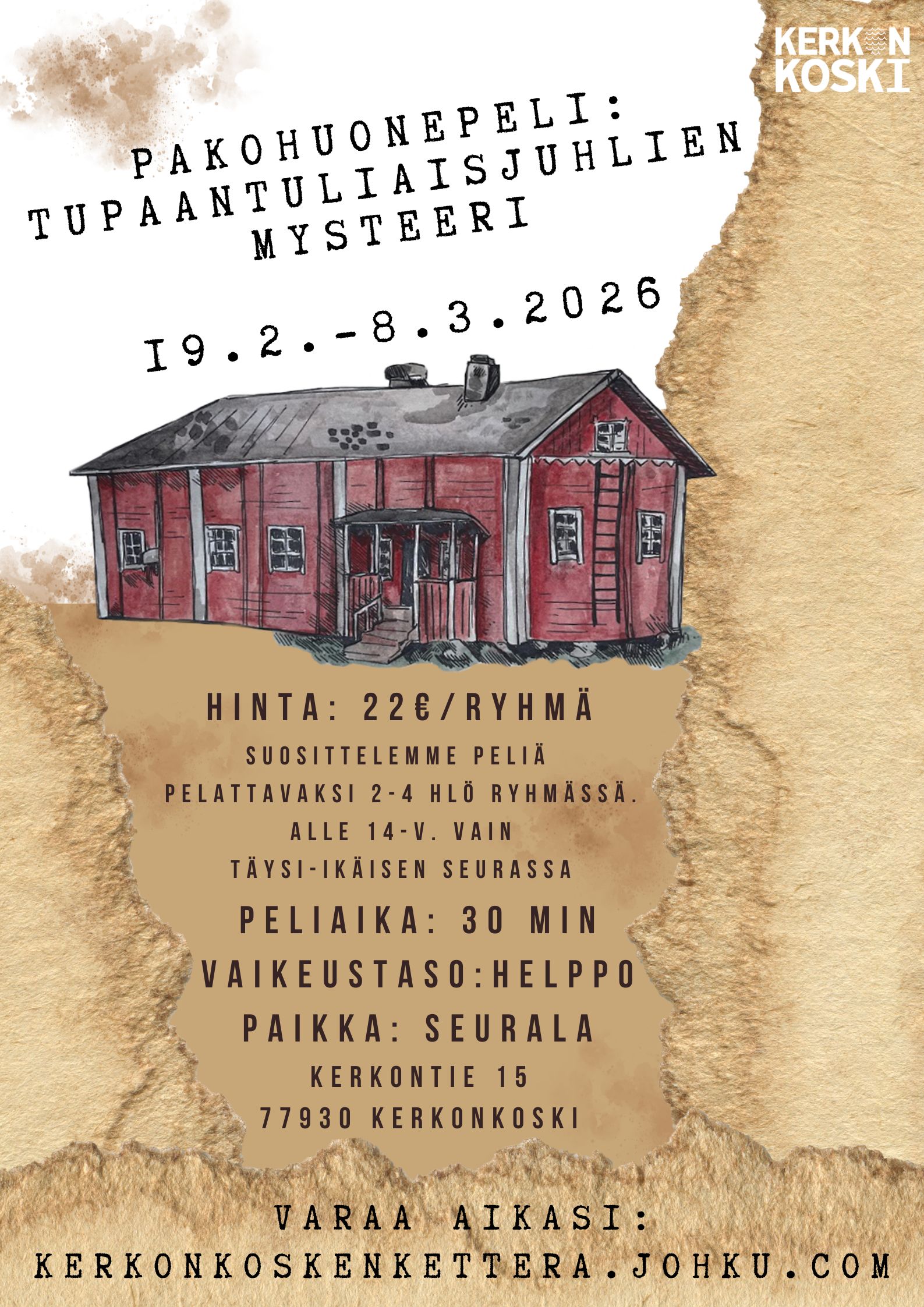 Pakohuonepeli on avoinna Seuralassa (Kerkontie 15) 19.2.-8.3.2025.